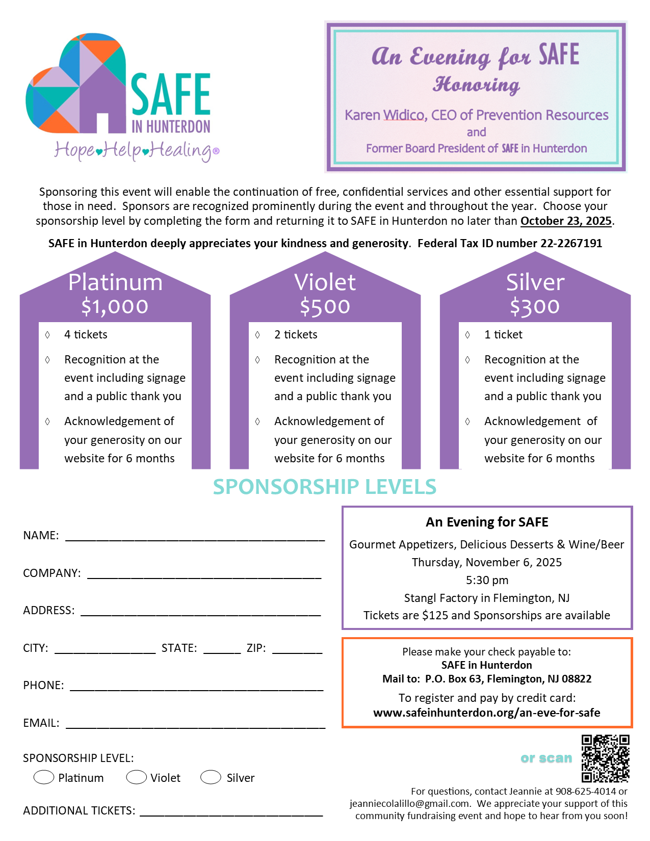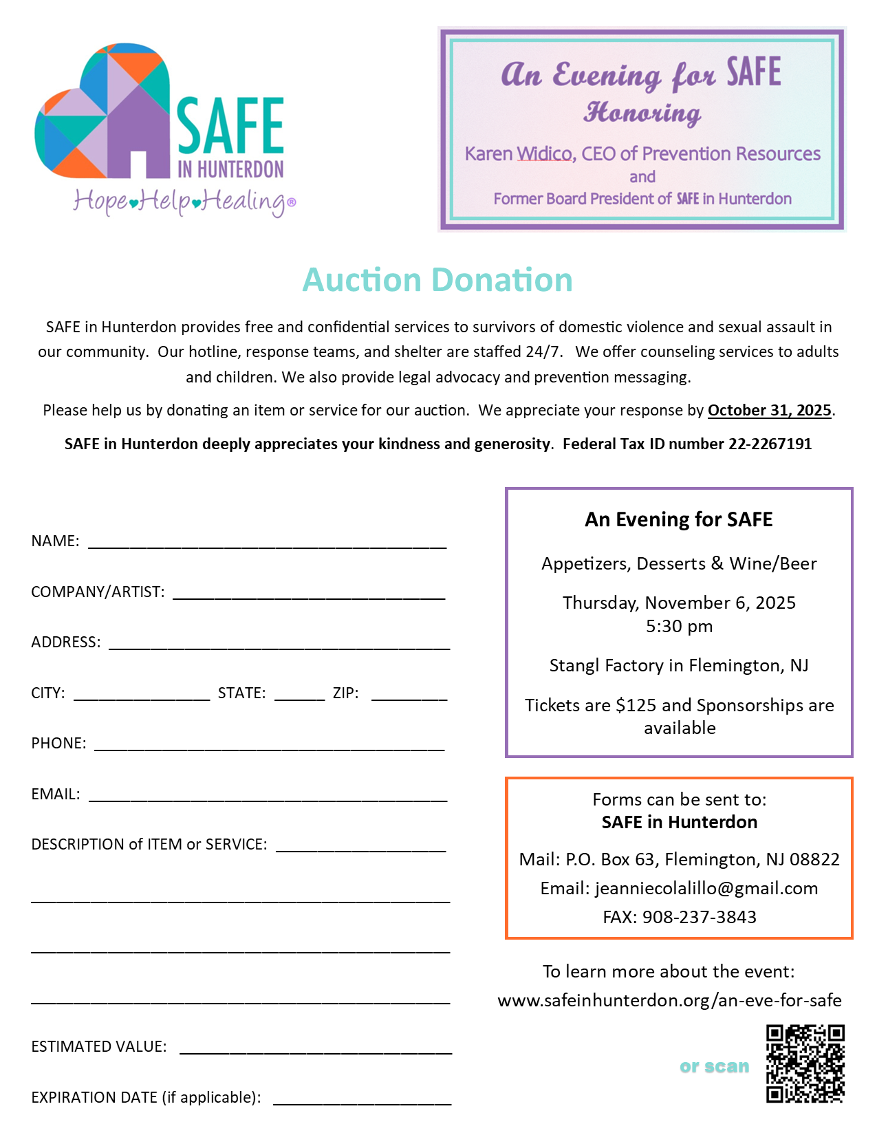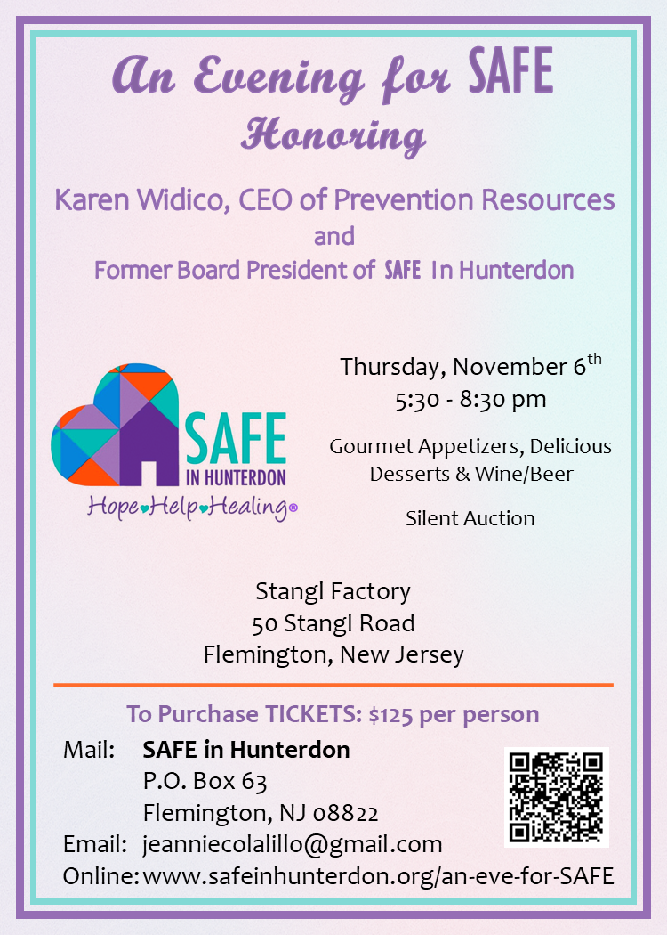 Building on our over 40-year legacy of providing services to survivors of domestic and sexual violence, SAFE in Hunterdon invites you to help us raise awareness and funds for our mission at An Evening for SAFE on Thursday, November 6 th at Stangl Factory in Flemington, NJ. The evening begins at 5:30 pm with a service of gourmet appetizers, delicious desserts, and wine/beer. At the event we will honor Karen Widico, CEO of Prevention Resources and Former Board President of SAFE in Hunterdon.